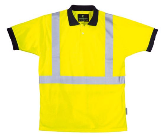 Tissu Haute-visibilité 100 % polyester piqué, 140 g/m² Col 100 % coton avec 2 boutons Manches Courtes, serrées Bandes Bandes rétro réfléchissantes cousues (2 bandes autour du torse et 1 bande sur chaque épaule)